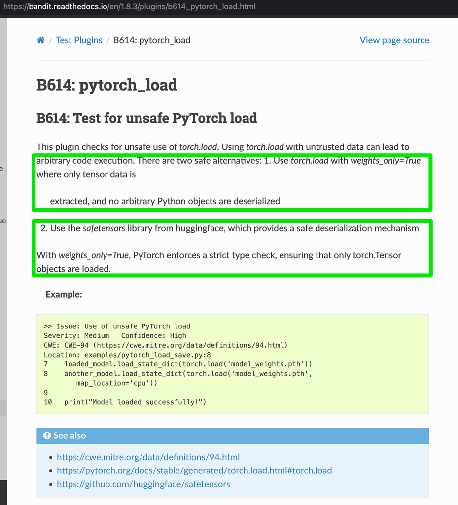 https://bandit.readthedocs.io/en/1.8.3/plugins/b614_pytorch_load.html https://cwe.mitre.org/data/definitions/502.html Let’s navigate to the first link, and understand the issue - https://bandit.readthedocs.io/en/1.8.3/plugins/b614_pytorch_load.html.
